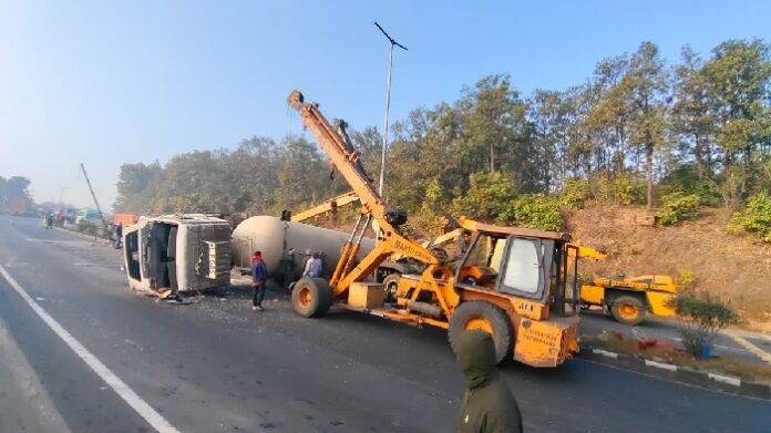पास एलपीजी से भरा एक टैंकर अनियंत्रित होकर बीच सड़क पर पलट गया। इस हादसे से रांची-पटना मुख्य मार्ग एनएच 33 पर यातायात पूरी तरह ठप हो गया। एलपीजी टैंकर पारादीप से नेपाल के काठमांडू जा रहा था।